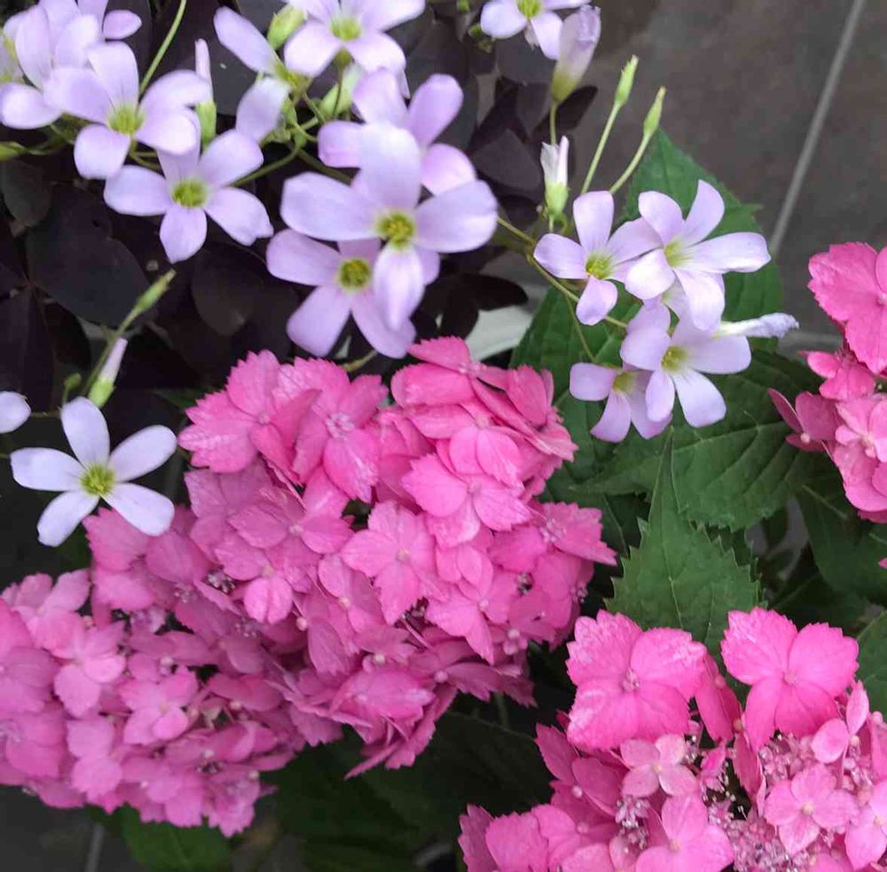 紫陽花【渥美のさくら姫】、オキザリストリアングラリスと並べてみました。