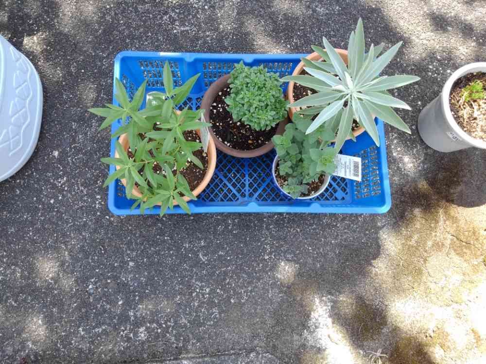 この前買ってきた、ハーブ、一つの籠にまとめました。らくちん!これで「日当たり求めて移動」とか「風強いから避難」という時ひょいと、かごさえ持てばずらせるので、得した気分。