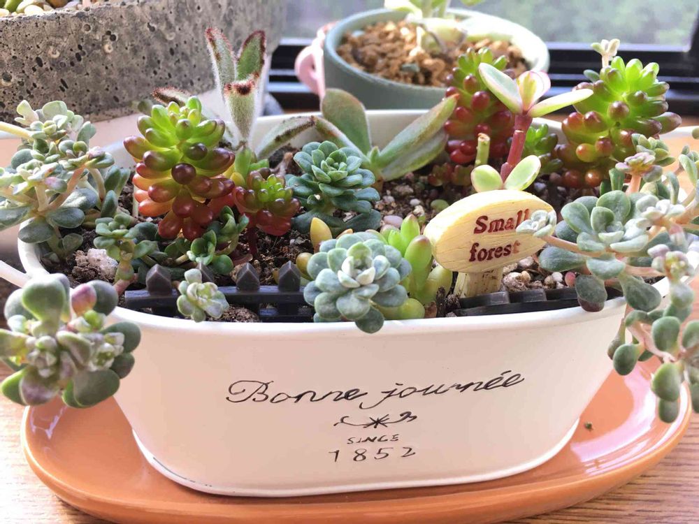 先月多肉たちの寄せ植えした時に余った子たちを適当に寄せ植えしたものです。「スモールフォレスト」と命名しました(100均にちょうどこの名前のミニ看板があっただけ)。