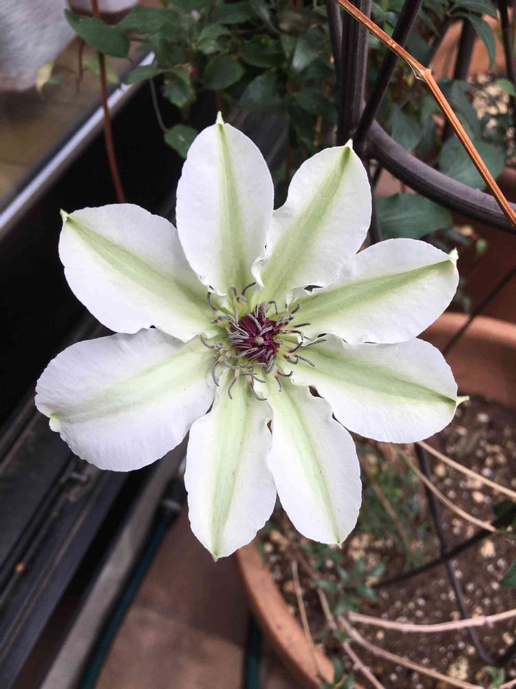 昨年の今頃にネットで生産農家さんから購入しました。枯れ枝の状態で送られてきました。問い合わせたら開花時期は終わったと・・・ (笑)。少し驚きましたが、早速弱剪定し整えて鉢植えにしました。心配したが、今漸く一輪咲いて始まりました。中国産原種テッセンと違って丈夫ではないが、日本らしい可憐な花です。準絶滅危惧種なので大切に育てていきたいですね。