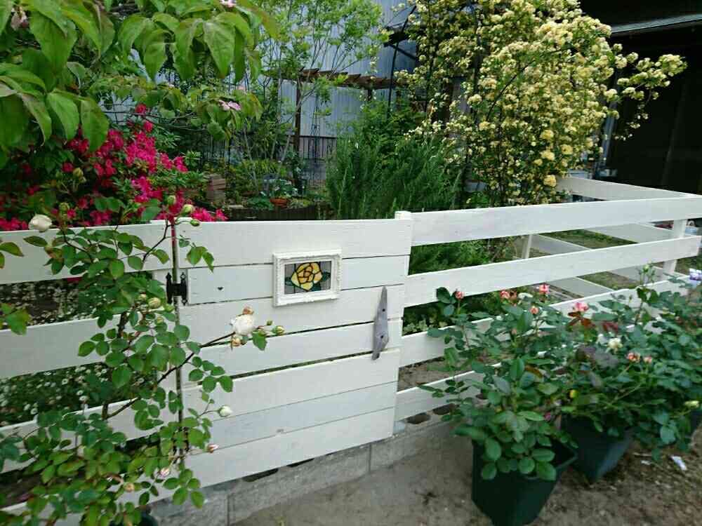 扉には自作のバラのステンドグラスもはめ込み 取手は拾ってきた流木で😁モッコウバラもツツジも散り始めてます。