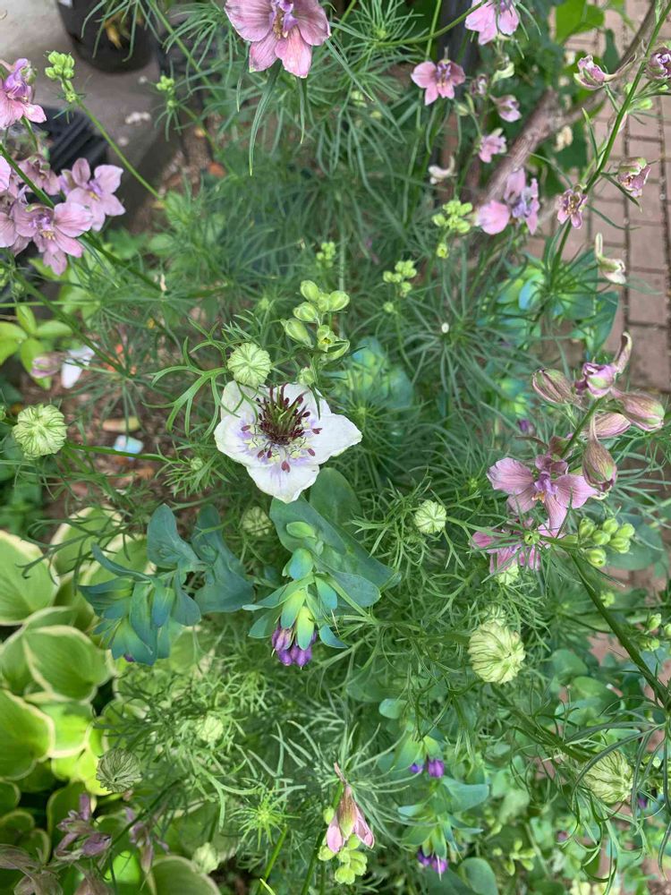 ピンクがかったうす紫色のチドリソウ ラークスパーの寄せ植えの真ん中にニゲラ アフリカンブライトが咲き出しました🌿