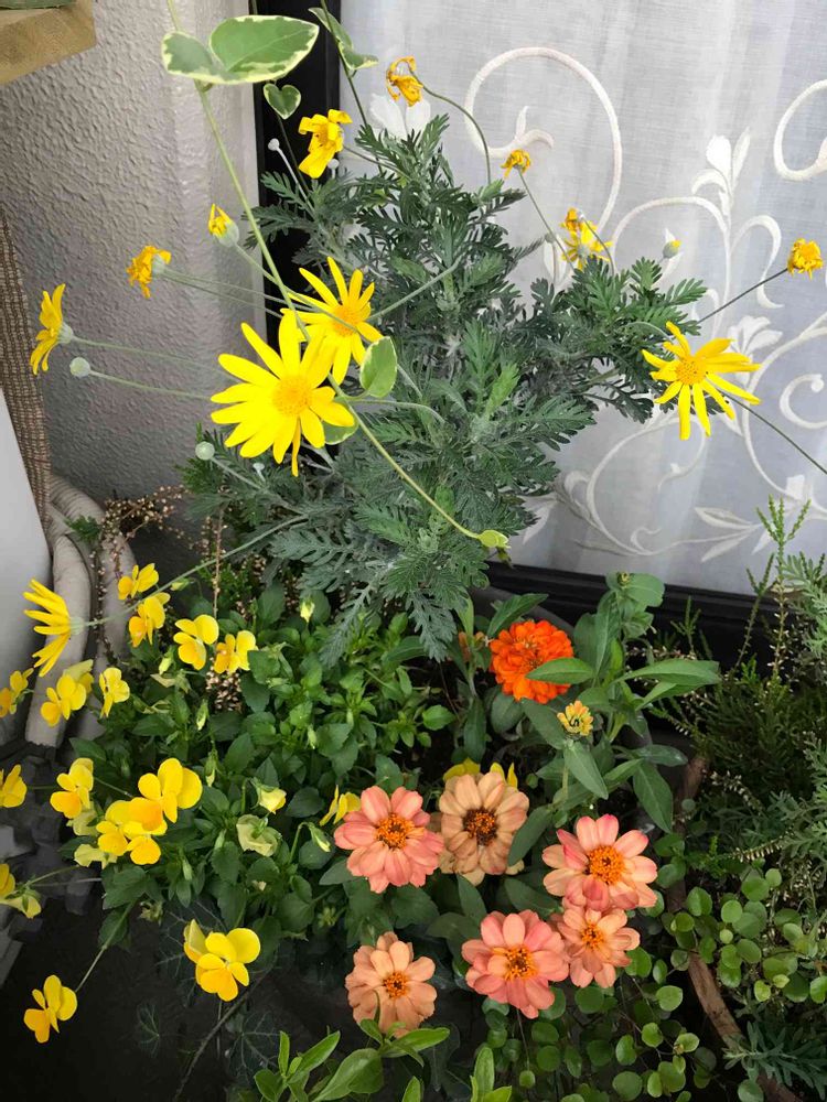 サーモンピンクっぽい色のお花はジニアではないでしょうか😊❓