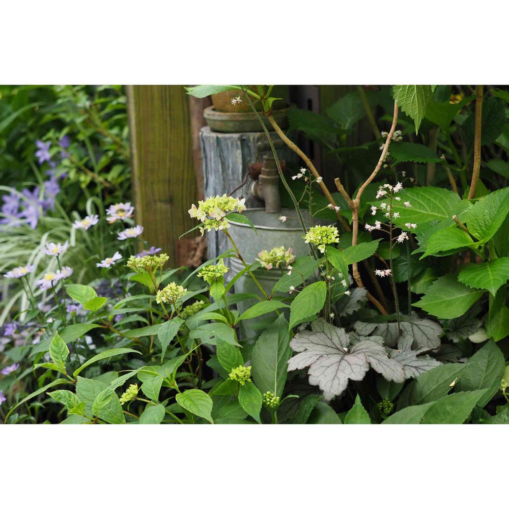 今は梅の木の陰になっている日陰...ミヤコワスレ,ヒューケラが咲いてヤマアジサイの花が咲き始め、常山アジサイにも蕾が出来ましたが、バックにあるアジサイは、今年は咲く気が無いようです。