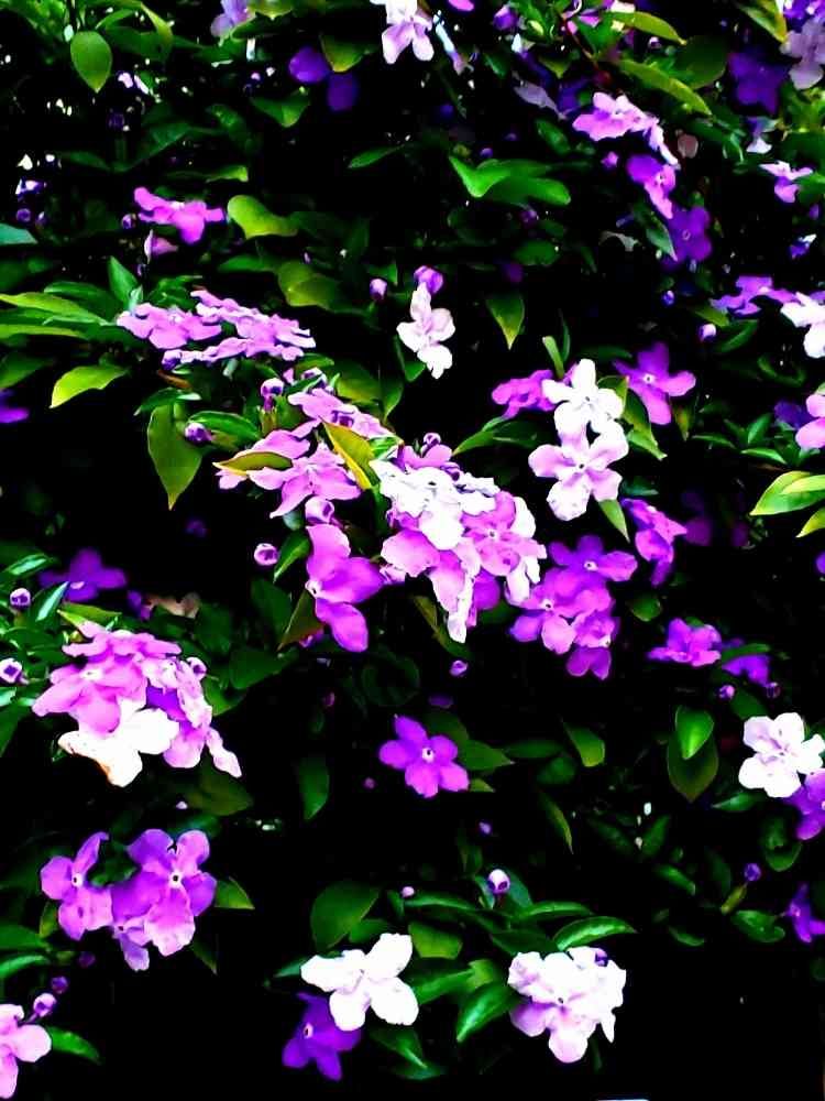 青い紫から白へと花の色が次々に代わり、大きな木が一面の花束のよう♡白と紫のグラデーションがとっても素敵です❣️香りは濃いジャスミンかな?熱帯の花のよう💕