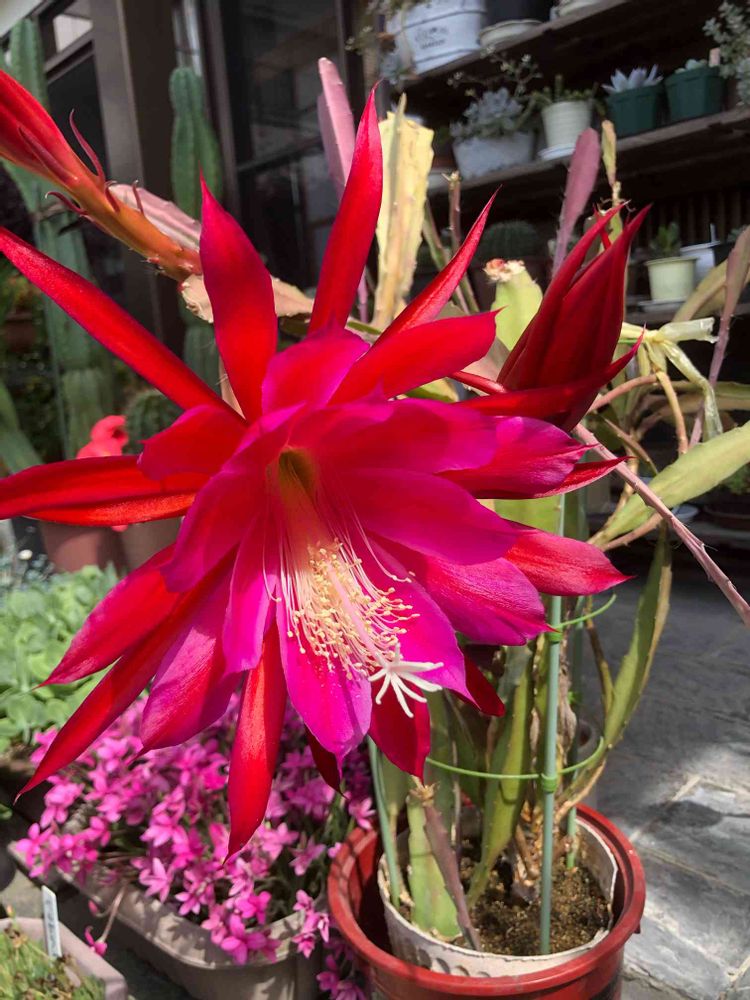 クジャクサボテンの最初の花が咲きました。花芽はあと7つあります。楽しみですね。