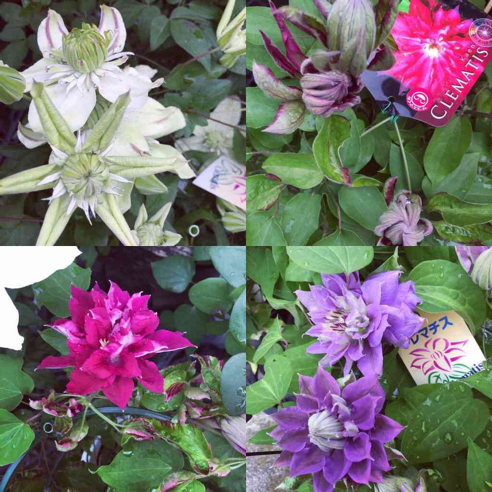 母の日ギフトにオススメ!💕🌿クレマチスは品種色々と。左上より時計回りに🌿白万重、火炎(カエン)、祭りだいこ、レッドスター です🌿