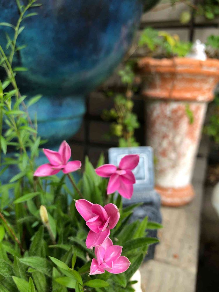 バックの青灰色のような陶器?が手前の花の色を引き立てていますね^_^
