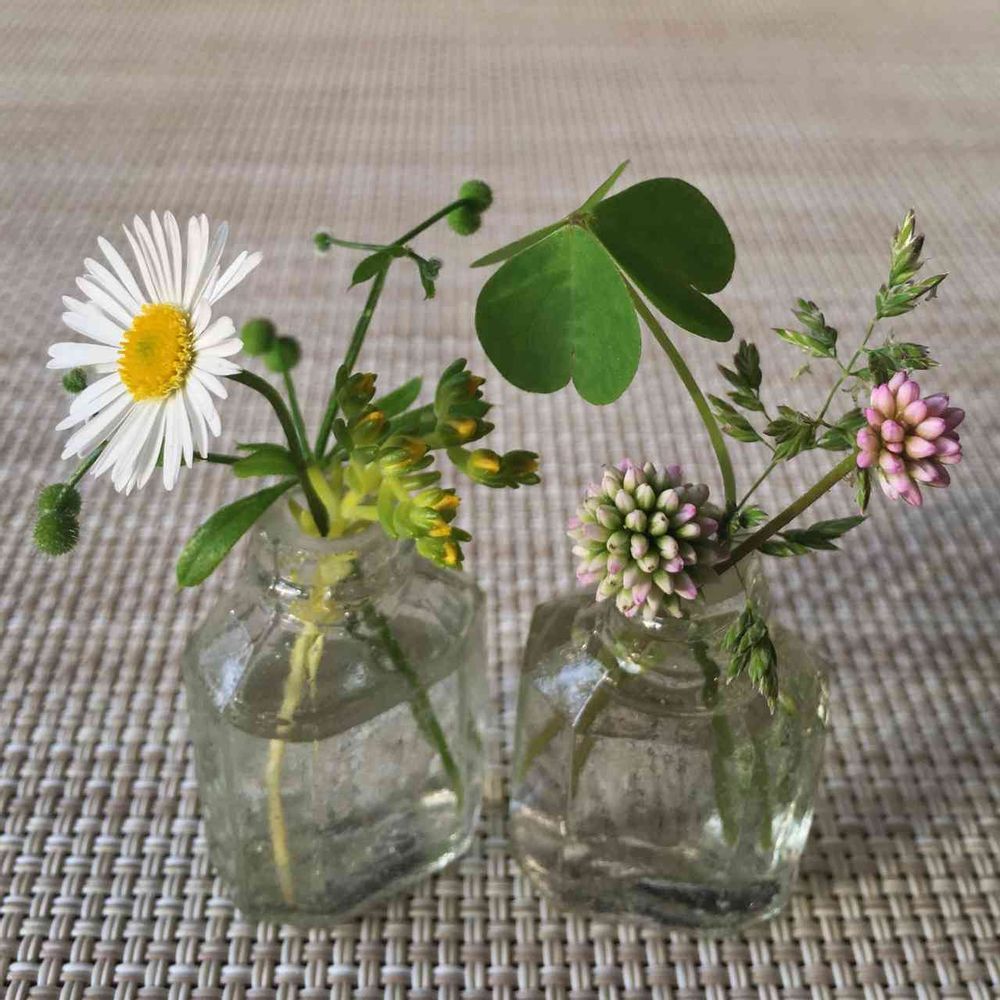 友人が誕生祝いにくれた小瓶に家の周りの植物を生けてみました。