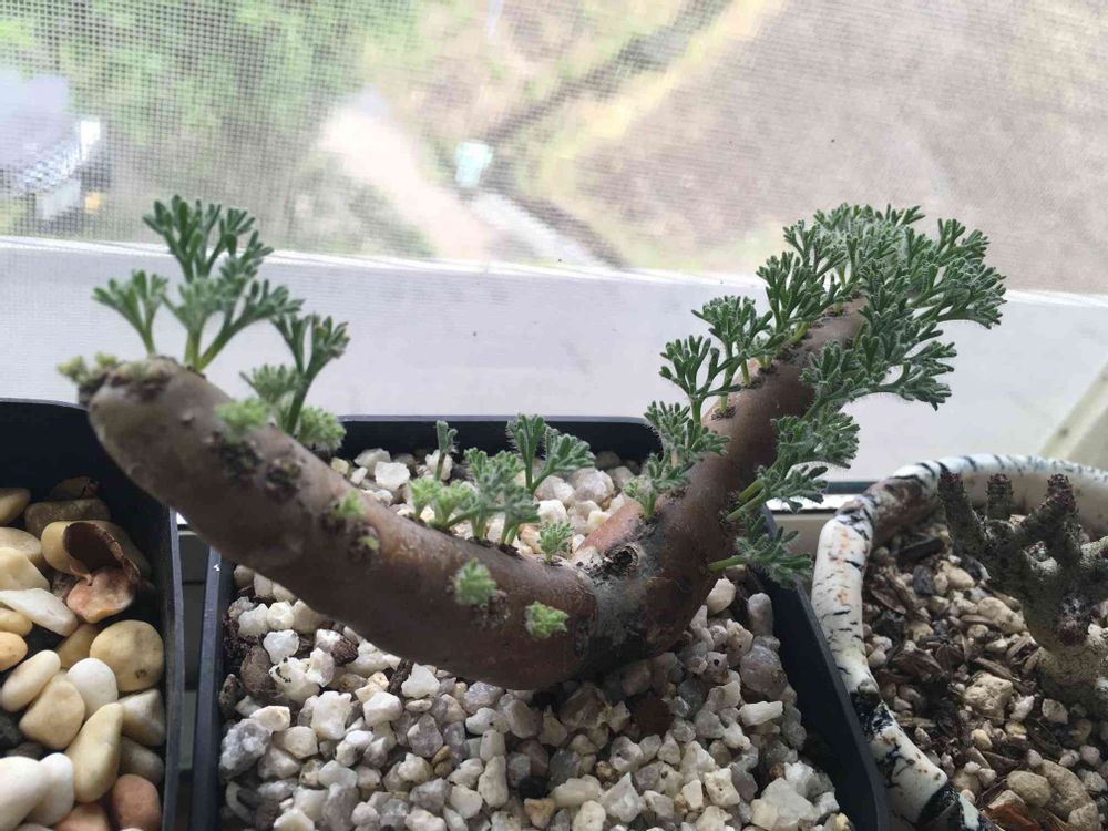 これはサルコカウロン属で、アフリカの多肉植物です。珍奇な茎から出る繊細な葉っぱの対比が面白い植物です。