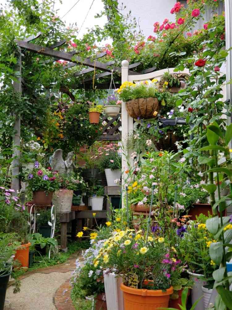 東側の外側の公道小道から見ると、2m前後の塀の上に花鉢が見えますが、こんなに花が沢山あるとは想像できないそうです。