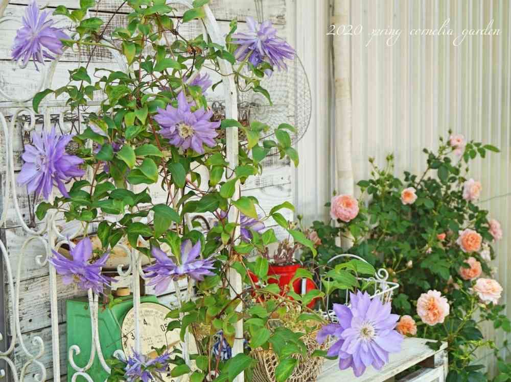 家にあったジャンク雑貨を並べただけだけど、クレマチスのおかげでお気に入りのコーナーになりました~✨