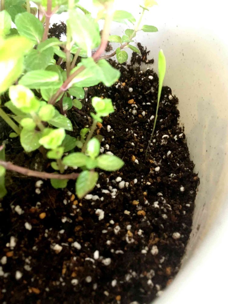 ブラックペパーミントの苗を覗いてみたら、横から何かの目が出ました。何かな?