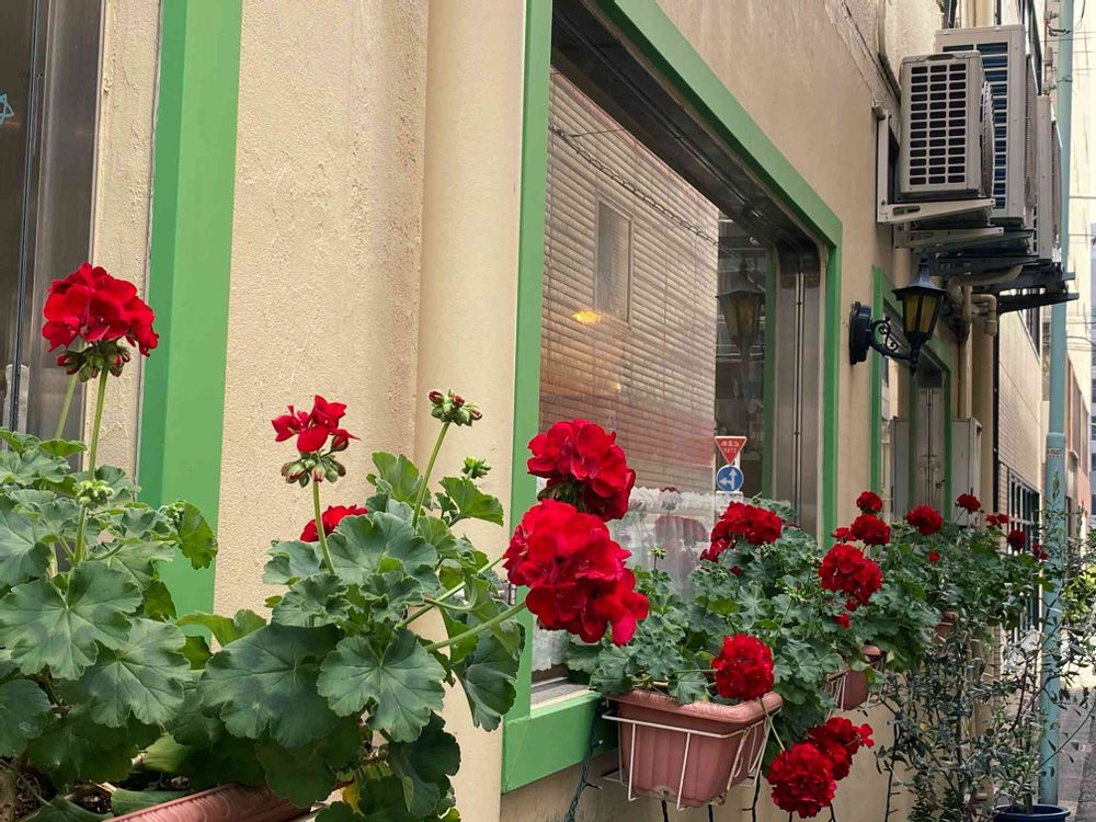 銀座松屋通りの路地を入ったらイタリアンレストランに真紅のゼラニウムが素敵でした♦️♦️♦️