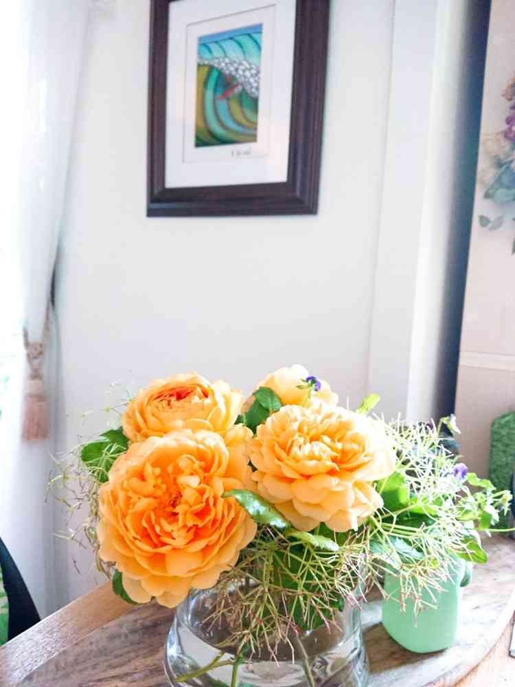 ベランダで、鉢植えで育てているイングリッシュローズ。熱帯低気圧の風の影響が強くなる前にお部屋に避難です。10年目を迎えますが今年もたくさんのバラを咲かせてくれます♪