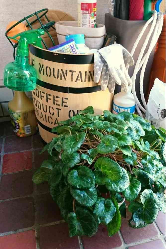 カイガラムシを駆除するため、花を抜いて玄関で養生しているミニシクラメン。毎朝、葉水かけつつ目を光らせています。