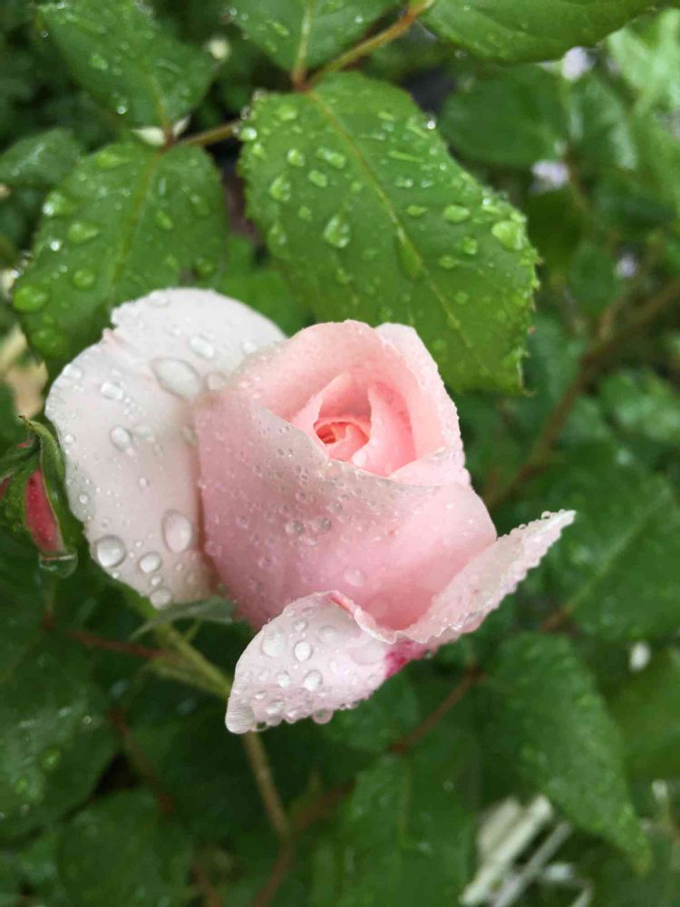 雨の中のナエマさん。ナエマさんが咲くとお庭が、メルヘンちっくになるが気がする。優しいピンクが癒やされます