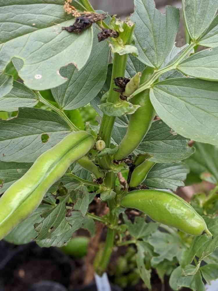 こぎたなく黒く縮れた花のあとから、そら豆の緑が顔をのぞかせます。