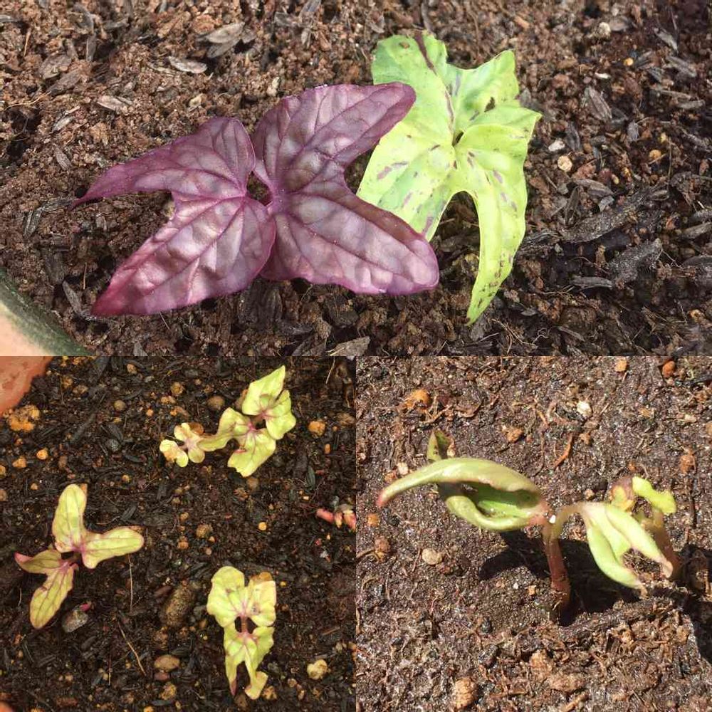 朝顔の芽いろいろ。上が紺と白の色々なバランスの花が出る松風で、左下が今年初めて蒔いてみた黄葉白糸柳牡丹の、多分出物なしのもの、右下がここ数年育てている黄抱丸笹葉喑紅車絞切咲です。この笹葉の芽は細く捻れています。