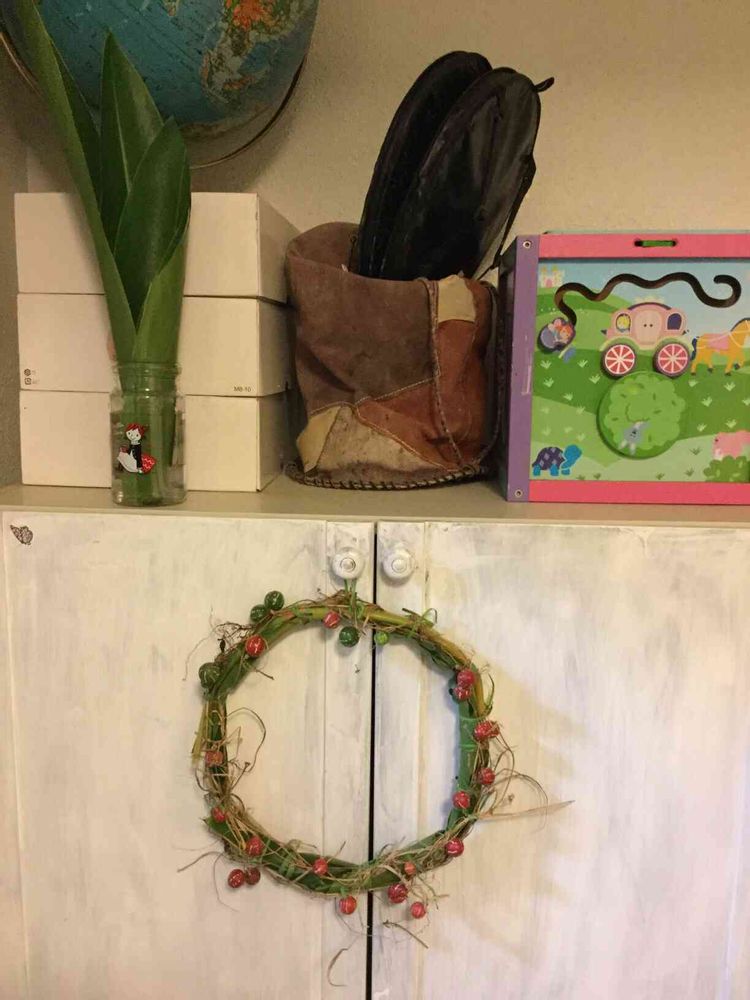 散歩で見つけたスイカ玉が連なるつる草を月桃でリースにした^_^