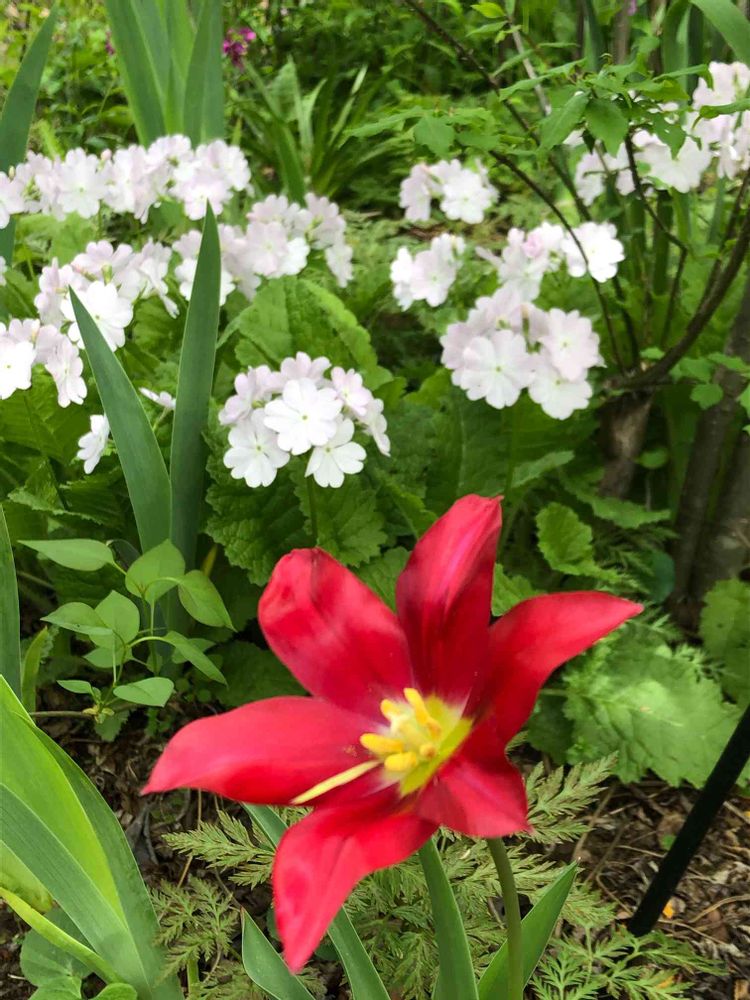 先日、さくら草の手前に、変わった花が⁉️ ビックリ チューリップでした。 思わず笑ってしまいますねぇー🤗😊😆