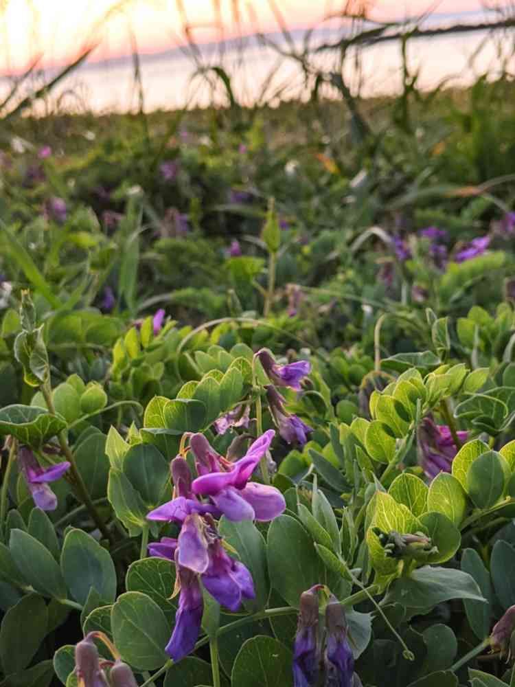 夕方の浜辺でハマエンドウの花か咲いています。美しい濃い紫💜