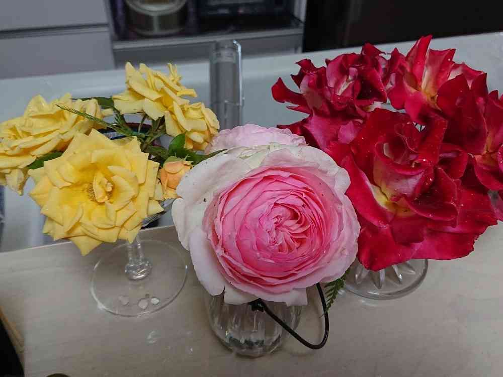 右からチャールストン、ピエールドゥロンサール、ミニバラ黄色(頂き物で名前知らず…)