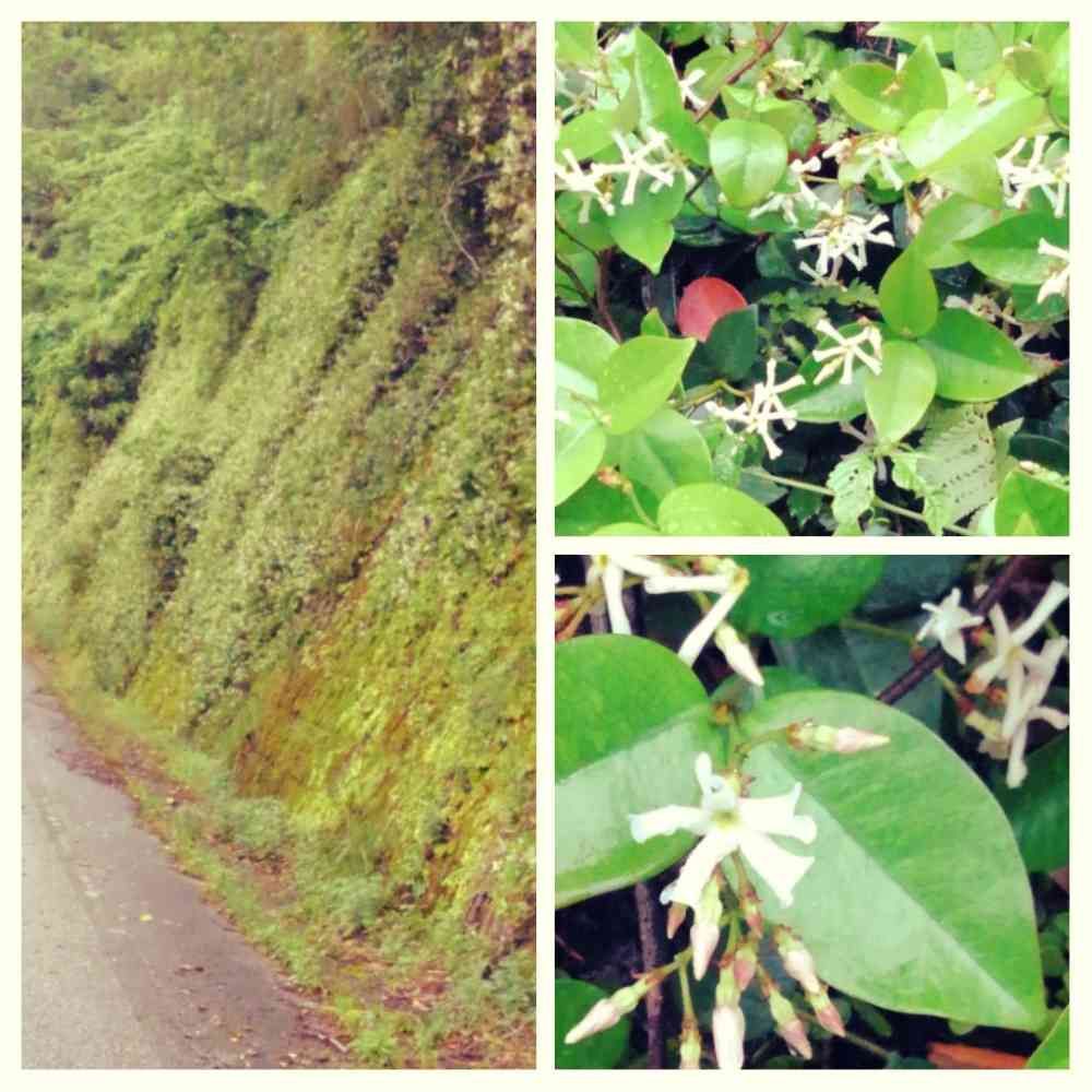 テイカカズラの変種とされる、違いは葉っぱが大きく丸い、葉裏や2〜3年の枝に毛が多い、蕾は薄いピンク色を帯びる、咲き始めは綺麗です、この日は曇天で小雨も時折、花は閉じています。60mに亘って生えています。
