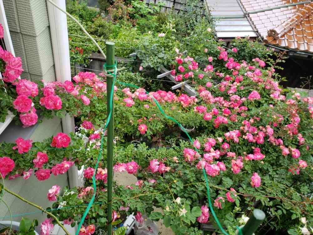 つるバラ「春風」は、今日が満開かもしれない。とてもよい景色です。妻はベランダのフェンスの隙間から覗いて、「すごいね、綺麗ね!」の連発でした。