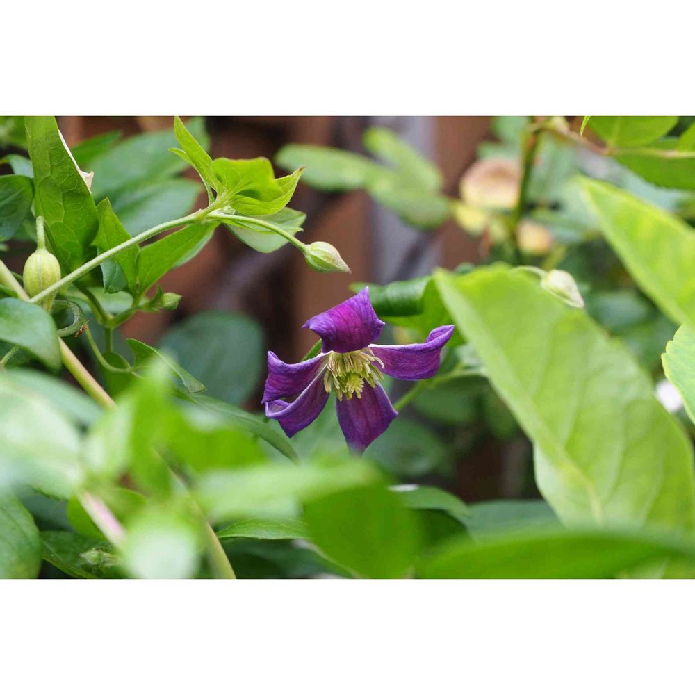 花径3~4センチ程の小さなクレマチスですが、下向きに咲くその姿は、始めは丸い感じで、咲きすすむと写真のように広がります。
