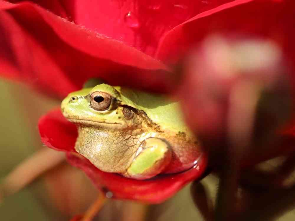 赤いバラにひかれてシャッターを押していると、意外なところで休憩?しているアマガエルさん発見😅