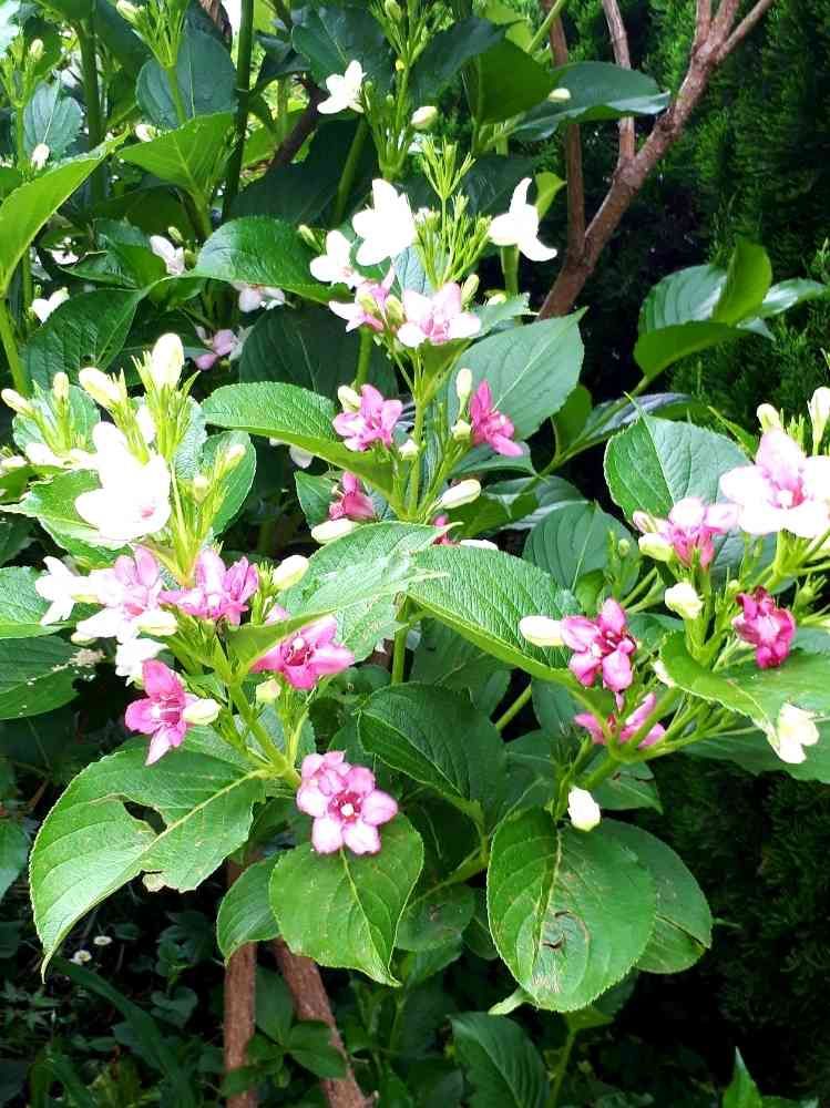 昼間のお散歩中、ご近所の垣根でちょうどこのお花を見つけて、可愛い〜と思ったんです❣️花色がだんだん変化するのでしょうか?グラデーションで咲いて可愛いですね💕