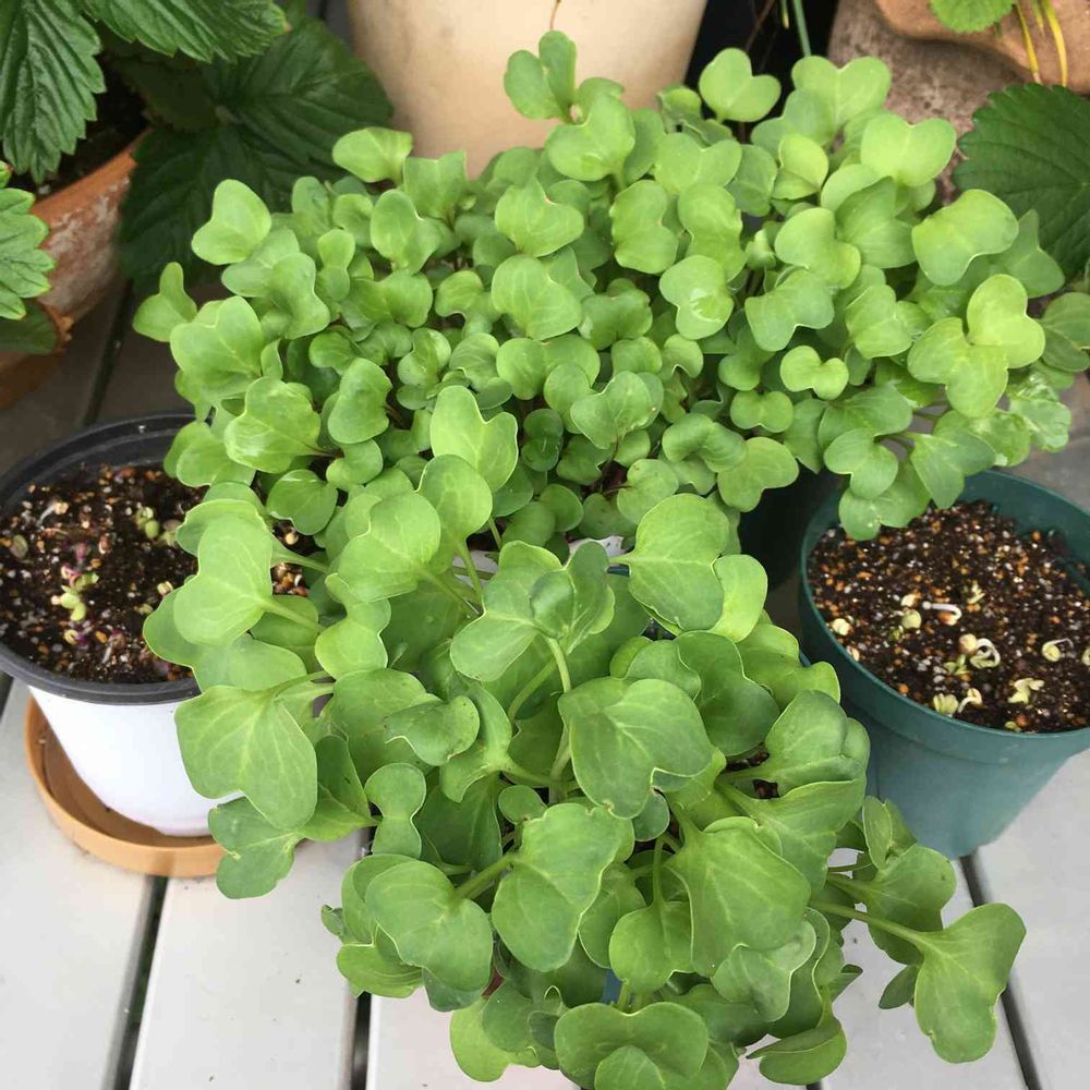 左右鉢の種がもう立ち上がり始めました。手前鉢カイワレは少し収穫しました。