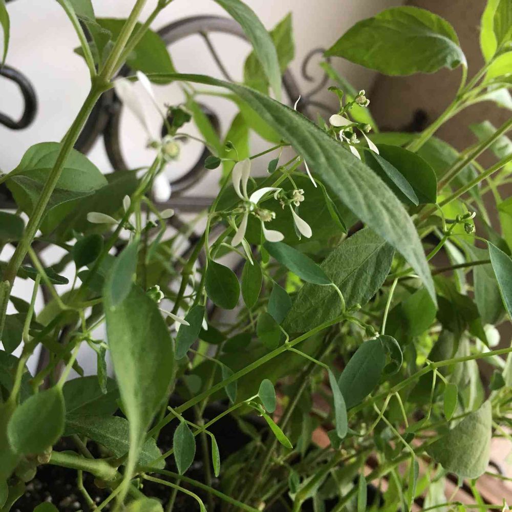 葉が茂る千日小坊の隙間で咲いたユーフォルビアダイアモンドフロスト。