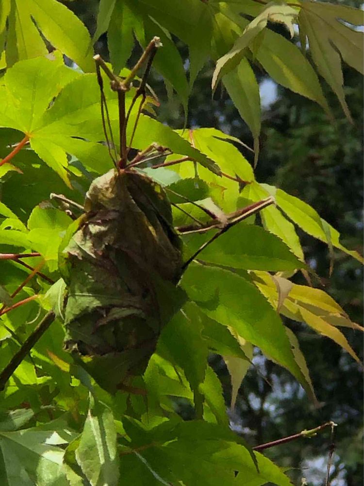 今朝私も薔薇の葉っぱからぶら下がる大きな蓑虫?みたいなのを見つけました。