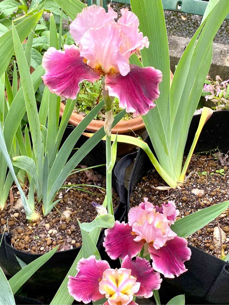綺麗な色合いのジャーマンアイリスですね🌸(*☻-☻*) 私も最近ジャーマンアイリスを購入しました。(まだ届いてないのですが、) 写真から、布鉢に植えていらっしゃる様子を拝見しました、私も手持ちがあるので、布鉢に植えてみようと思います(*´∇`*)