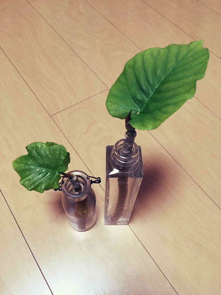 4月末に剪定したウンベラータを水差しにしてたら、先にこっちから新芽が出ました