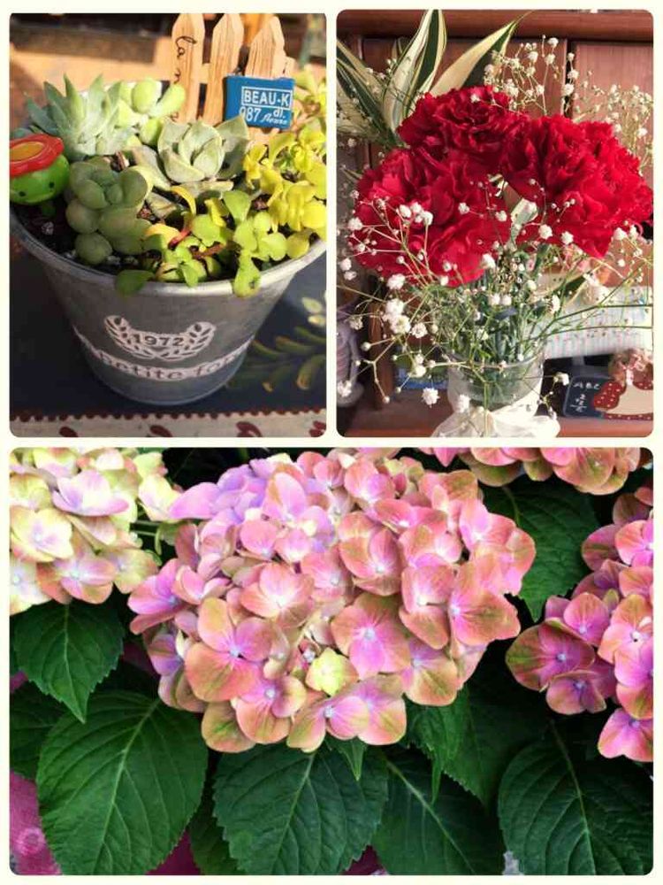 紫陽花の色合いが素敵ですね。カーネーションとカッパの多肉ちゃん寄せ植え、娘さんから(╹◡╹)♡素敵な母の日ですね。私まで幸せになれた気がしました。