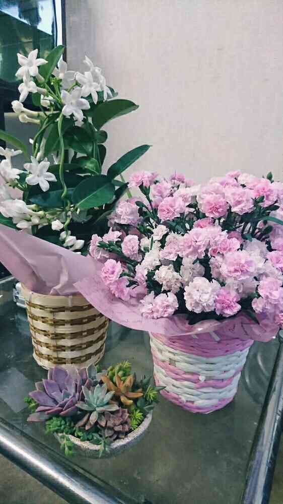 多肉ちゃん寄せとカーネーションと、仕事関係の方からの(義理)の、ジャスミン(笑)┐('~`;)┌ せっかくなので、一緒にパシャリ💮