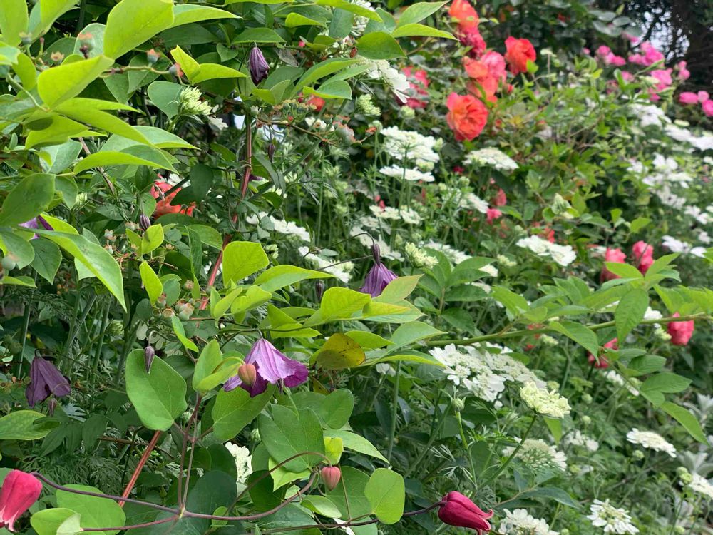 ピンクの壺型のクレマチス 天使の首飾りと名前のわからないビチセラ系のムラサキのクレマチス が咲くこのエリアがとても気に入ってます☺️