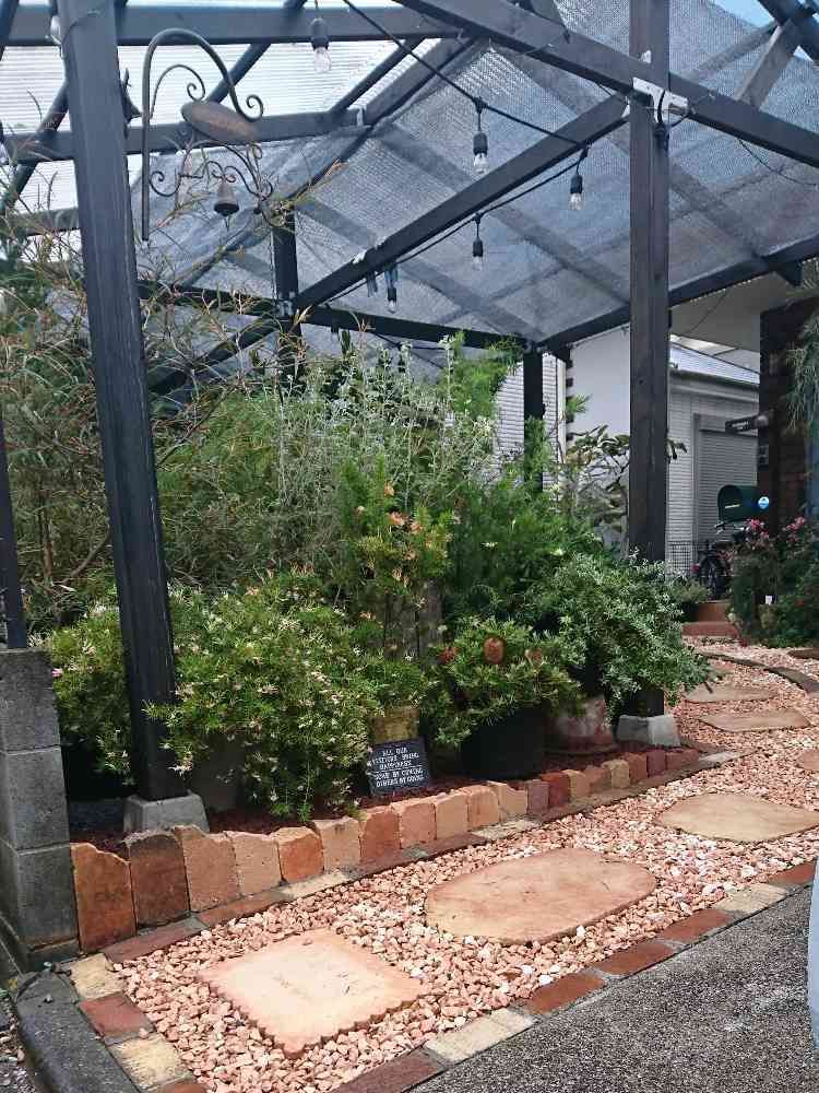小雨の中、縦置きレンガを施工しました。傾斜があったため、高さ合わせました。(適当に)レンガは割れたやつ50円で自分でも割りました。