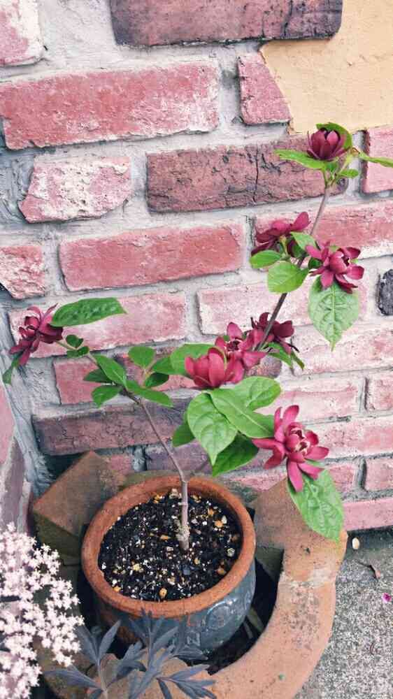 国バラ🌹出店で凄く売れてた「カリカンサス・ハートレッジワイン」黒花ロウバイのハイブリッド。かわいそうだけど鉢植えで頑張ってもらいます💦