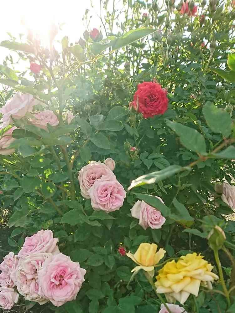 三色のミニ薔薇🌹🌹 夕日に照らされ