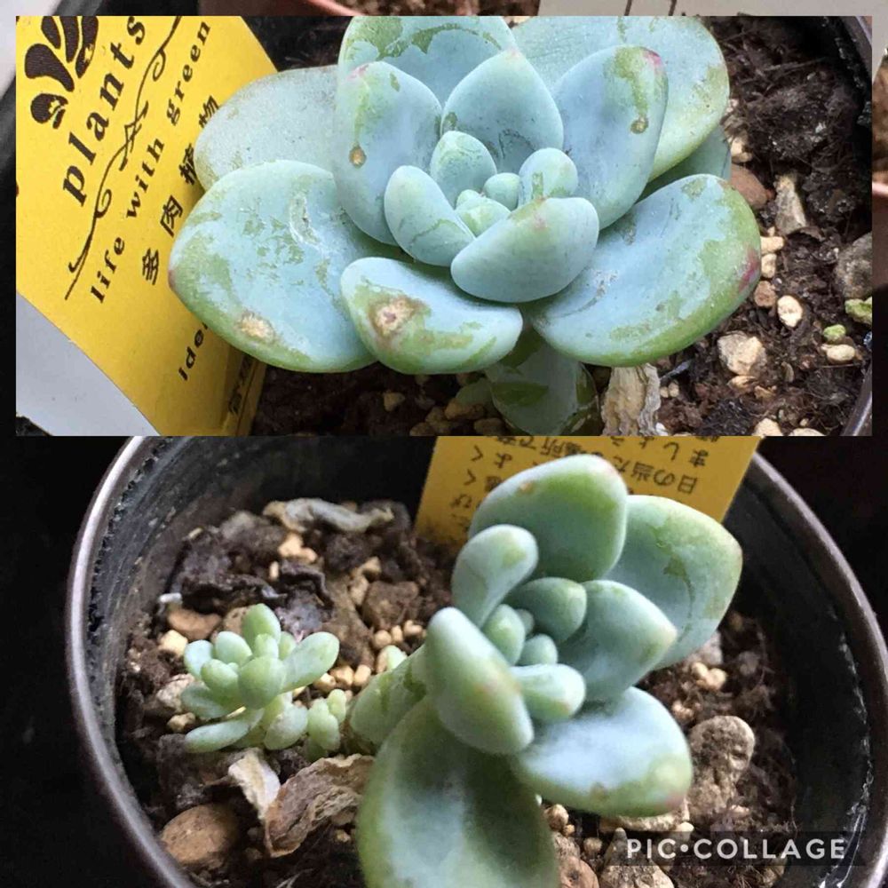 ロッティの様子がおかしい!斑点が出ている、触って見ると、ブヨブヨしてる。調べると、ブヨブヨの葉は戻らないらしい。取った方がいいと思って、柔らかい葉は全部そーと、取ったら、なんと、根本に子株が二つ。雨の日に見たら、ロッティの所だけベランダから雨だれが落ちてたらしい。乾かして様子を見る事に。良かったー。ロッティ、復活するかなー^o^。とりあえず、雨の日は、その場所は空けてあります。なんとかならないかなー^_^。