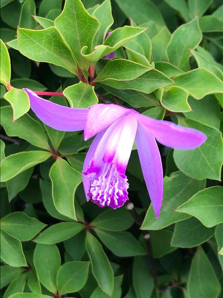 しらん(紫蘭)が垣根からひょっこり顔を出していました。