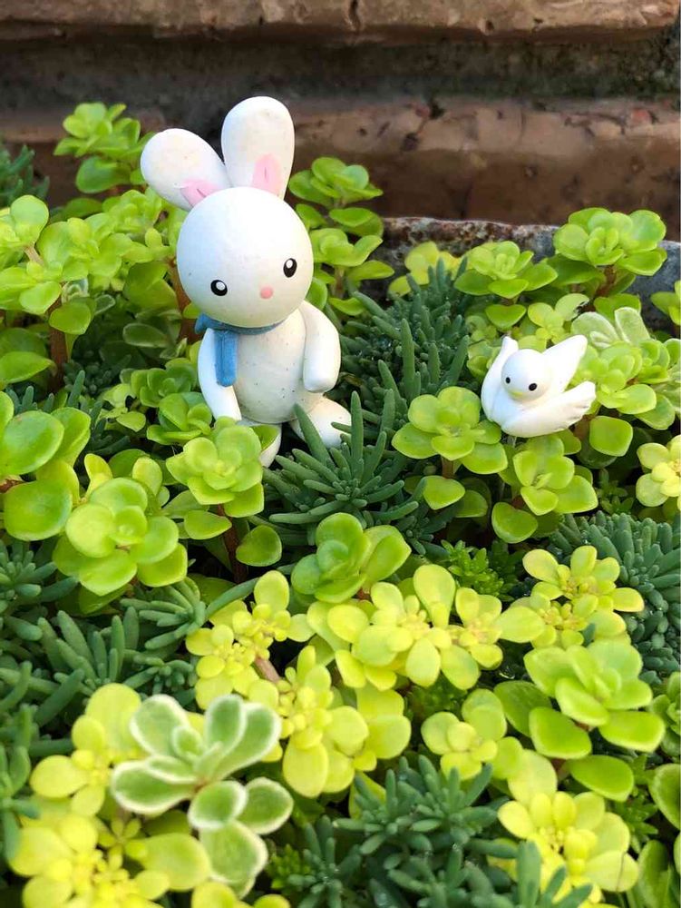 セダム畑で遊んでいるピョン太君と小鳥さん☘️