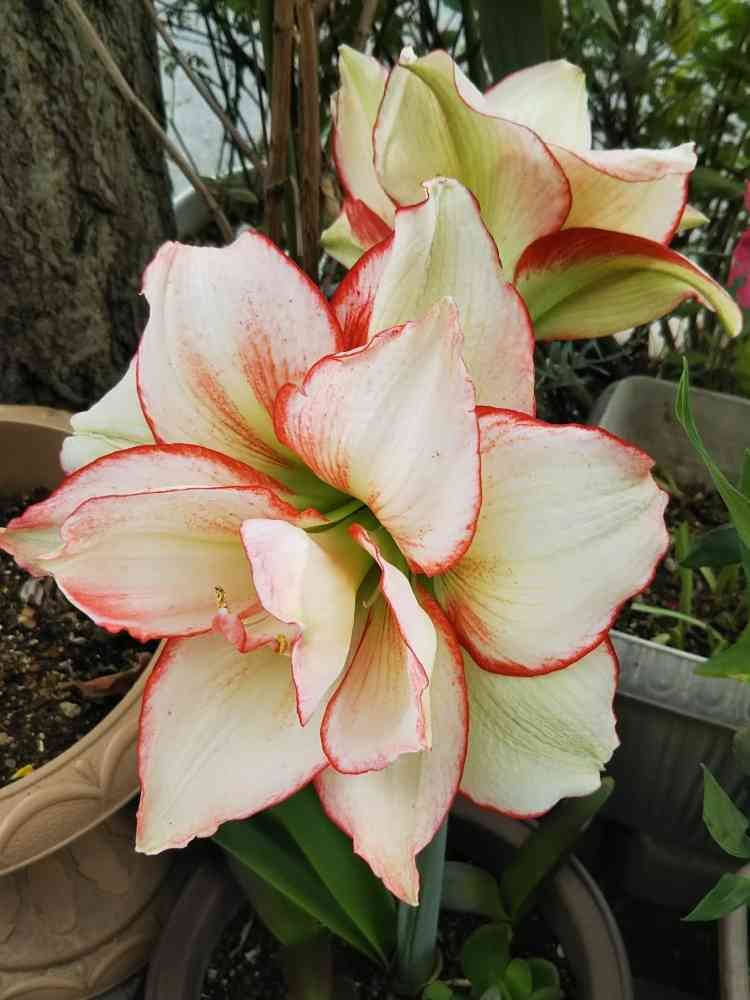 白に赤い縁取りの八重咲きの💮アマリリス💮のお花がとても豪華に咲いていました😍💟