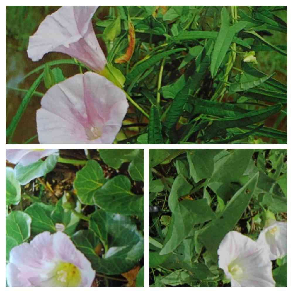 花は少し小さい、色は淡い、葉はヒルガオの矢じりの所が二分する。セイヨウ……もアイノコ……も見た事無いので省略