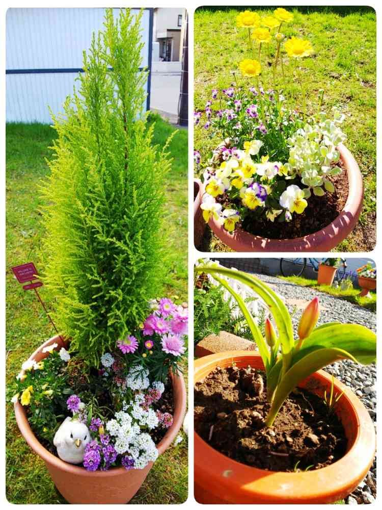 去年のコニファーウィルマが大きくなりました🌲そして毎年恒例のテキトー過ぎる寄せ植え🤣屋根から落ちる雨に当たり、下のお花が大ダメージ😱慌てて置き場所を変えました🌼チューリップは、まだまだ咲きそうで咲きません🌷