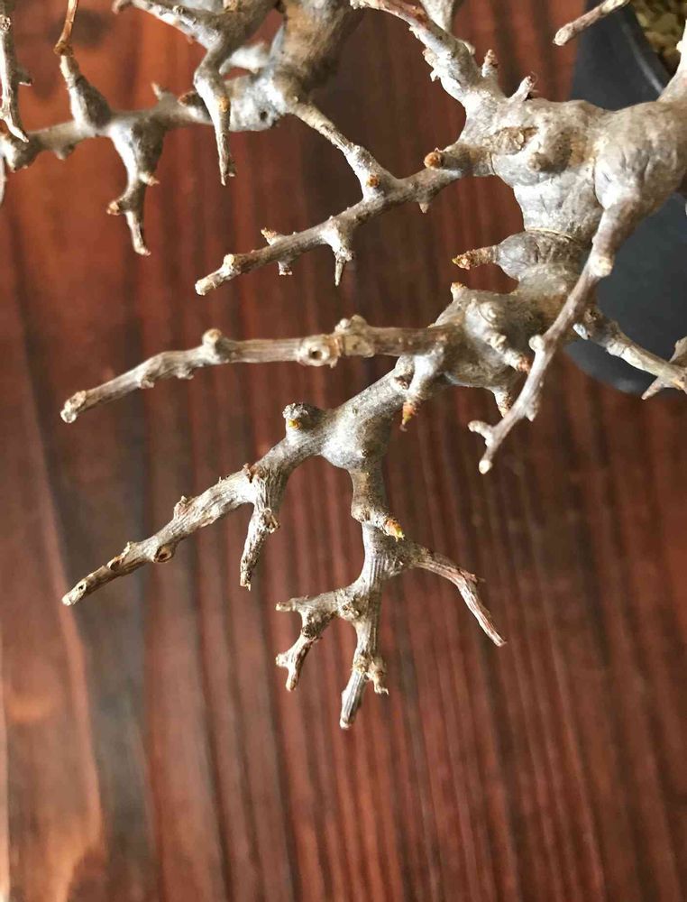 ただ私もこちらがはじめてのエイルだし、ソマリアの植物は難しいイメージがあるので発根済の物を購入してます。極乾燥地帯でまとまった雨が降る期間が2ヶ月くらいとの事なので葉が落ちてから水やりもしてません。その為枝先はシワが出ています。今触ってみたけどポコポコの部分はかたいままです💦寒い時期は鉢を温めるようにしてました。